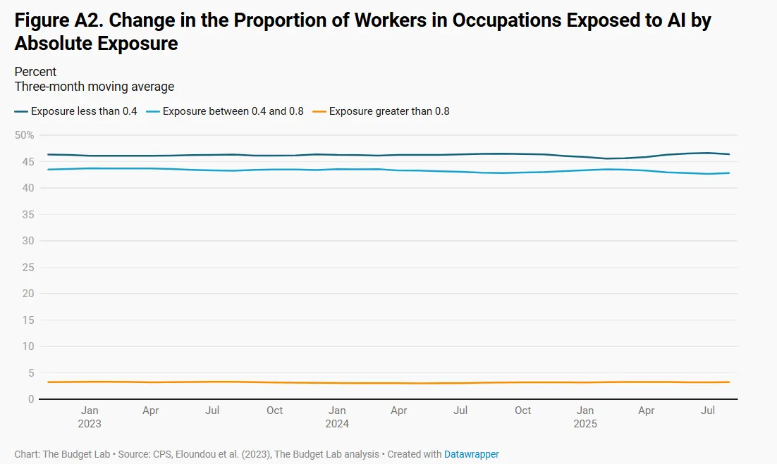 But data tells a different story. Yale researchers examined multiple metrics, including occupational mix changes, industry-specific shifts, and AI exposure levels across different job categories. Workers in occupations theoretically most exposed to AI automation, based on OpenAI's own metrics, showed no signs of displacement. About 18% of workers hold jobs in the highest AI-exposure category, a proportion that has remained flat since January 2023.
