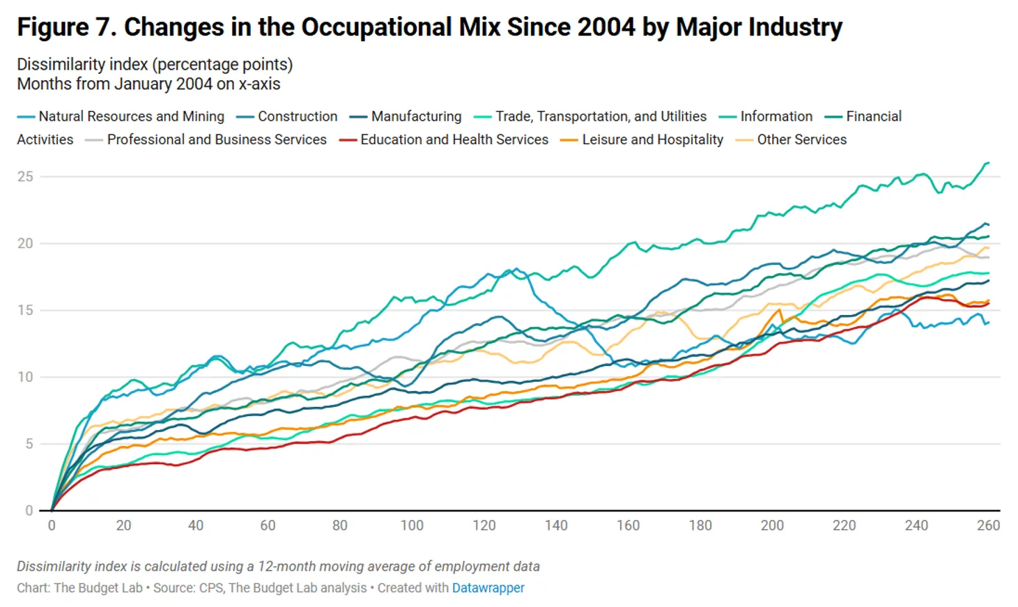 The information sector, which includes newspapers, movies, and data processing, showed the largest occupational shifts. But these changes began before ChatGPT's release, suggesting industry-specific factors rather than AI disruption. Finance and professional services displayed similar patterns—movements that predated the supposed AI revolution.