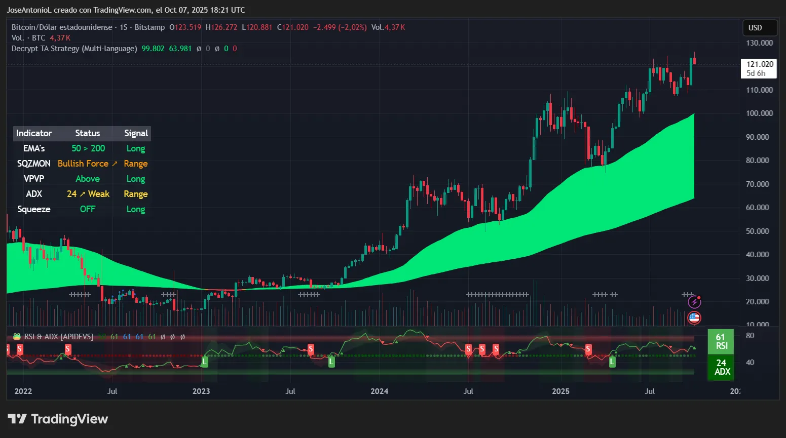 Bitcoin's current price action shows strength, but technical indicators reveal some yellow flags beneath the surface. The cryptocurrency has climbed roughly 11% over the past seven days, pushing from around $112,000 at the start of October to its peak above $126,000. It is currently trading at around $122K after a post-all-time-high correction.