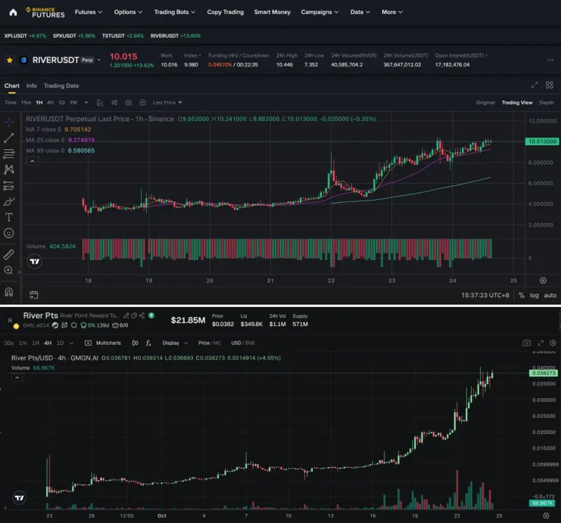 This continuous process turns the airdrop into a live market, where users can either hold River Pts for higher future conversion or lock in profits by shorting $RIVER perpetuals, creating a natural balance between liquidity and time-based appreciation.