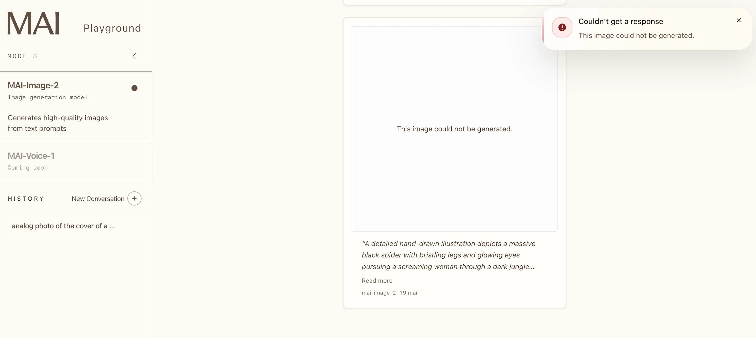 MAI-Image-2 is aggressively filtered—more so than Google Imagen, and more so than OpenAI’s DALL-E. We ran our usual test of a cartoon drawing of a spider chasing a woman, and got a flat refusal. Again, that's a drawing—of a spider. The content moderation here is tuned to a level that will frustrate anyone doing creative work in gray areas, horror illustration, or anything that reads as remotely tense.