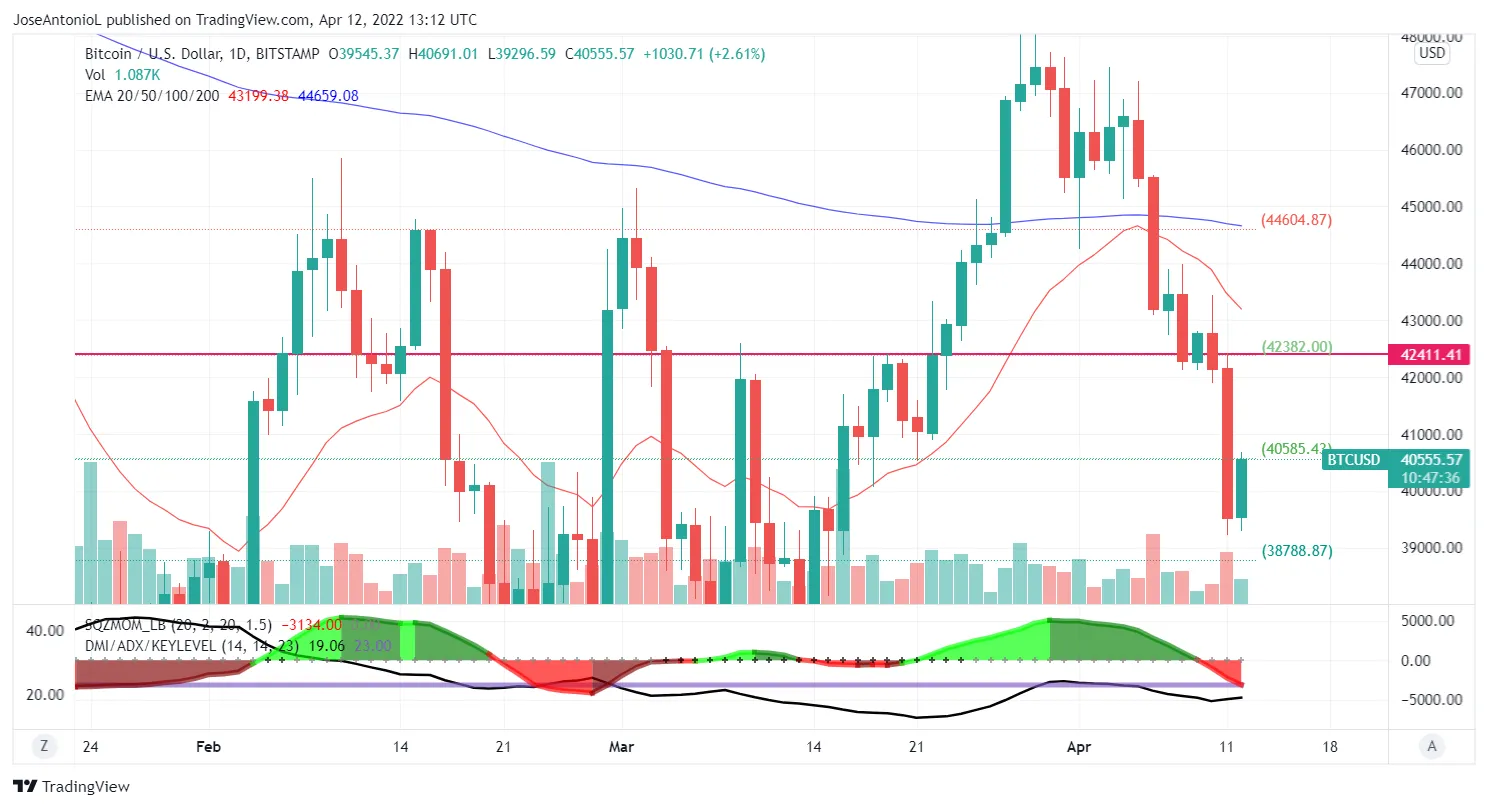 Precio del Bitcoin al 12 de Abril de 2022. Imagen: TradingviewDe las 10 principales criptodivisas por capitalización de mercado, Solana y Cardano han sido las más afectadas, cayendo un 6,4% y un 5,9% respectivamente en las últimas 24 horas.